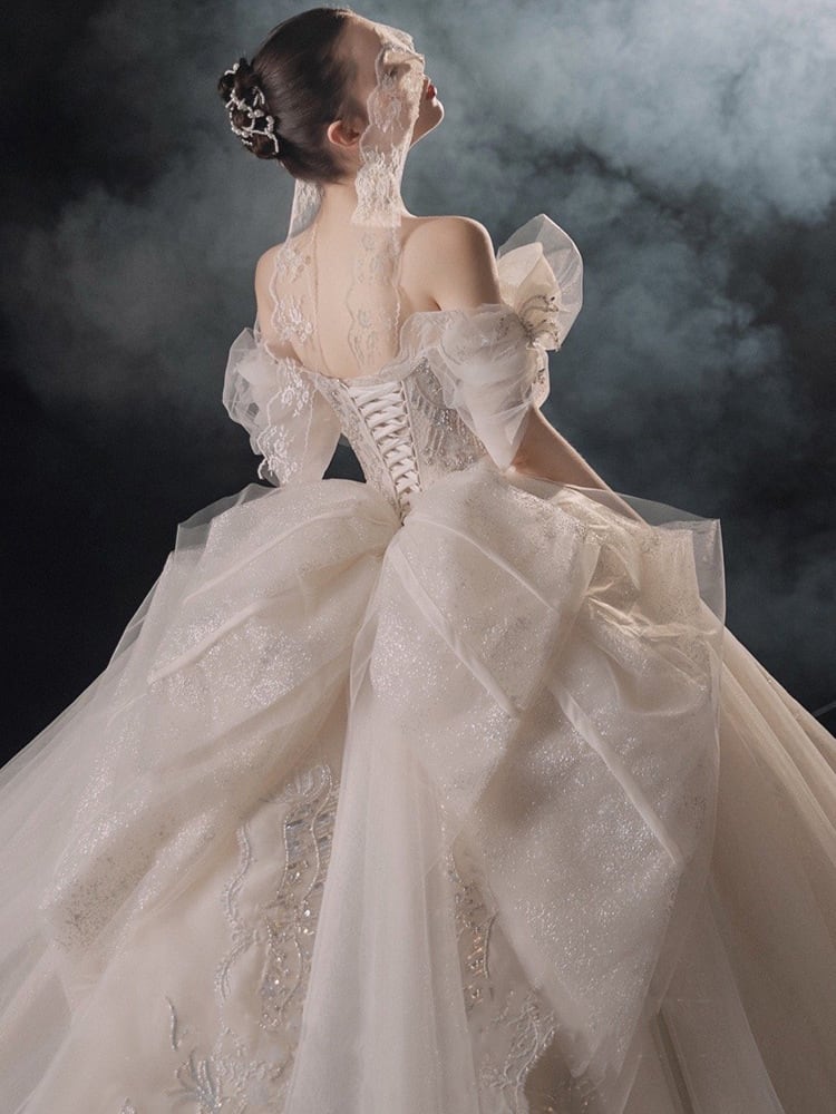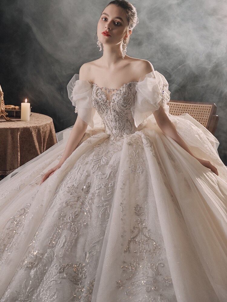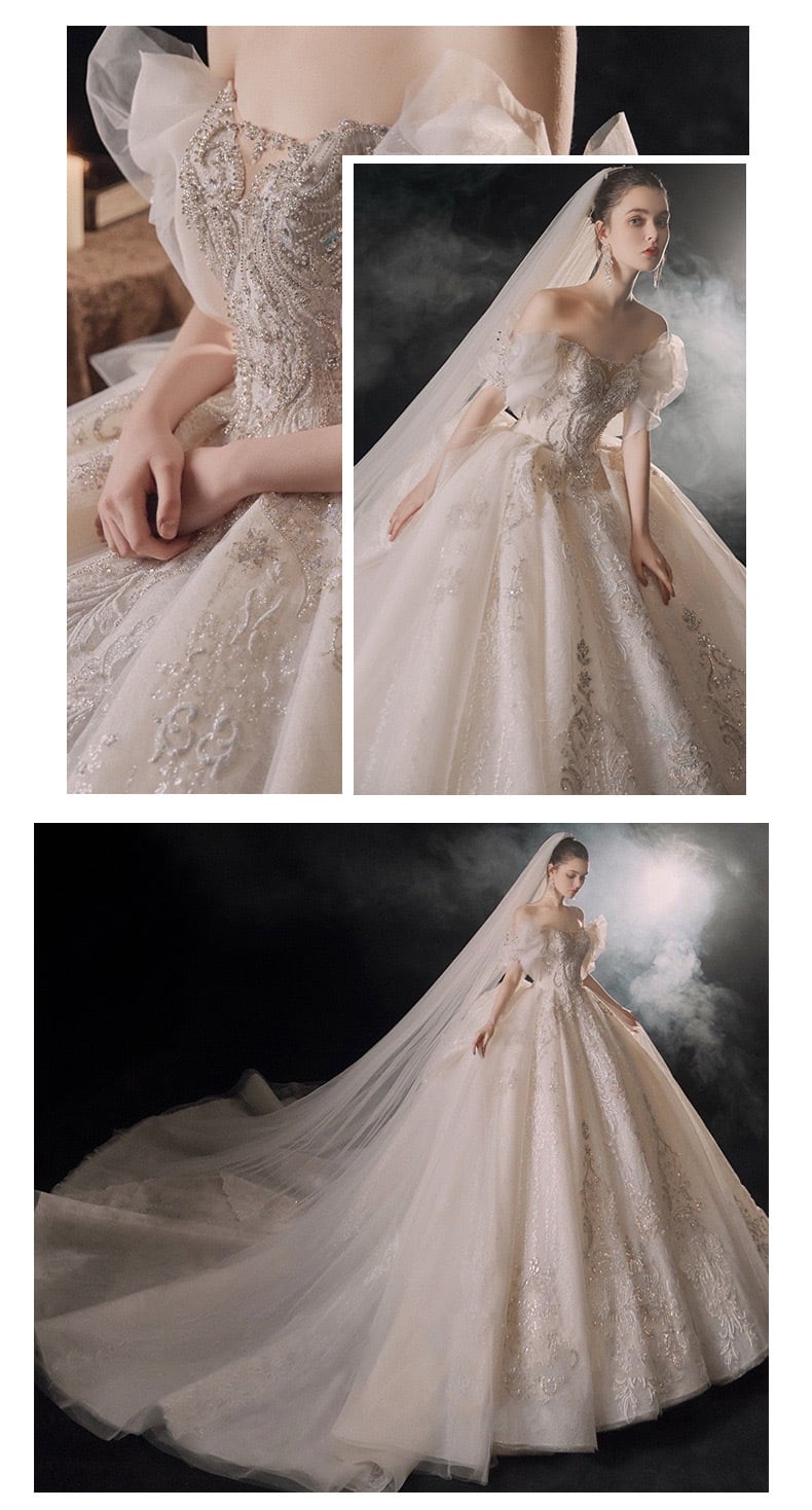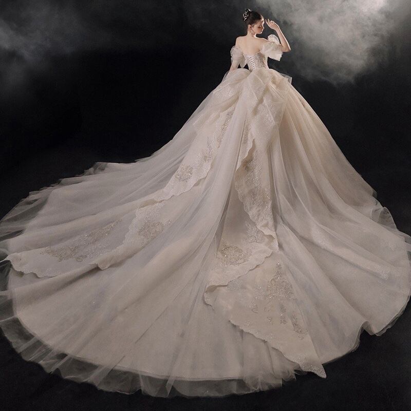 エレガントな花嫁を演出するバルセロナプリンセスウェディングドレスが、送料無料でお届けします!華やかなオフショルダーデザインと、美しいレース刺繍が特徴です。背中の大胆なカットアウトは、女性らしい魅力を引き立てます。ウエストをしっかりと細く見せるドレープデザインで、スタイルもより一層美しく見えます。気品溢れるこのドレスで、一生に一度の特別な日を盛り上げましょう。 バルセロナプリンセスウェディングドレスは、デザインから製造まで全てがハンドメイドで行われています。世界中から厳選された最高品質の素材を使用し、マスターの技術によって一つ一つ丁寧に作り上げられました。自信を持ってお届けすることで、多くのお客様から高い評価をいただいています。 このウェディングドレスは、一見の価値があります。上品さと華やかさが融合したデザインは、誰もが憧れる花嫁像を体現しています。このドレスを着れば、人々の視線を釘付けにすること間違いありません。自信と輝きに満ちた花嫁になりたい方にぴったりの一着です。