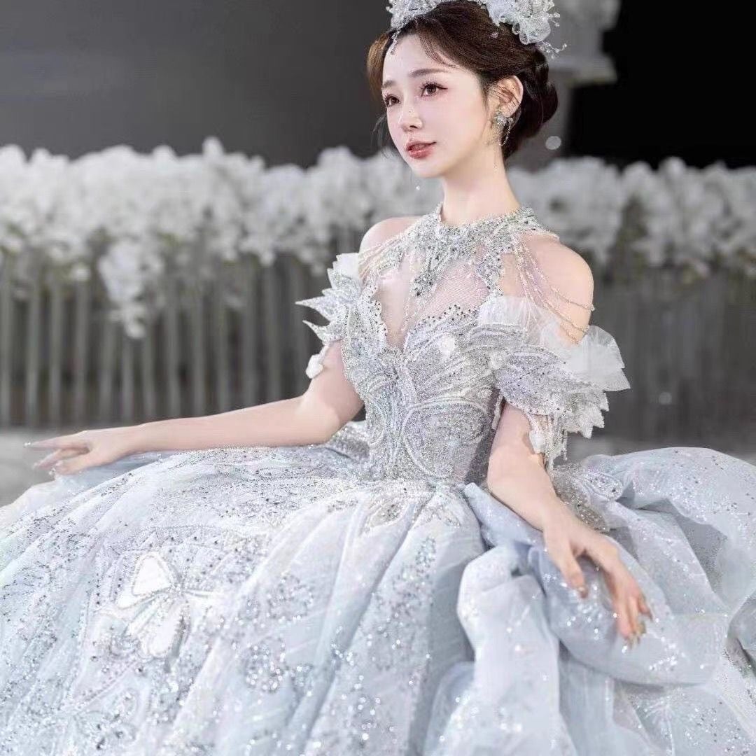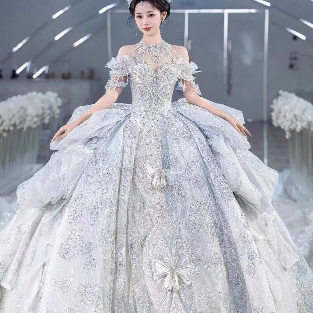 豪華なウェディングドレスが登場しました。華やかなレースやビーズ、フリルが施された贅沢なデザインは、幸せな一日をより特別なものにします。背中のリボンやドレープがエレガンスを演出し、挙式の際のキラキラ感を引き立てます。 このウェディングドレスは、一生に一度の特別な日にふさわしい完璧な1着です。おしゃれな襟元やウエストラインのディテールに気を惹かれ、思わず憧れを抱いてしまうことでしょう。お客様が歩む一歩一歩を、誇り高く美しく飾り立てます。 お取り扱いの際には、保管やクリーニングが必要です。大切な日のために、最高の状態で輝き続けるためのご配慮をお願い致します。挙式を彩る特別な瞬間に、この豪華なウェディングドレスで輝きましょう。